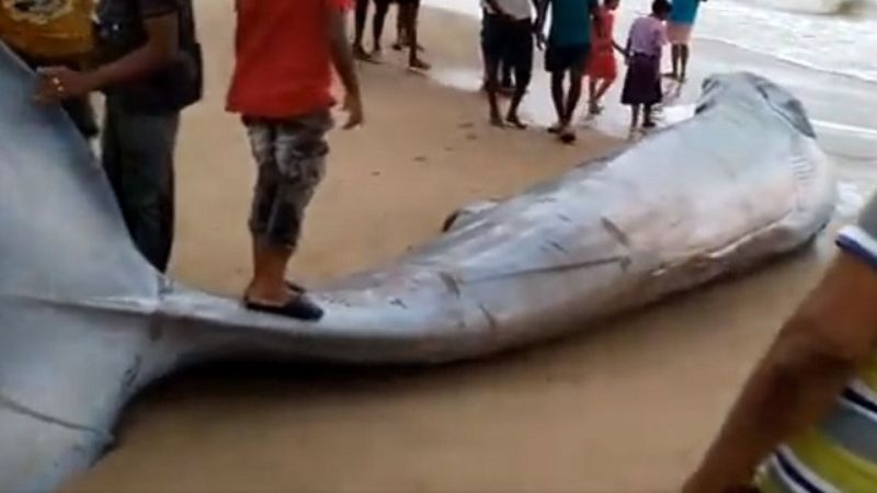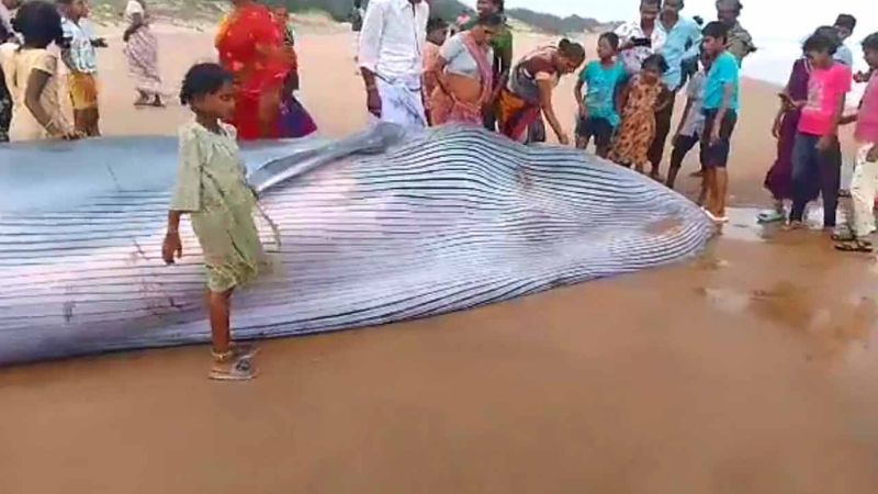A 25 ft long blue whale (#endangered species), weighing around 5 tons washed ashore and later died at a beach in Santhabommali mandal of #Srikakulam dist. The nearby villagers thronged the area to have a look. #BlueWhale #AndhraPradesh #Whale #Tekkali pic.twitter.com/IwoKVeVgao