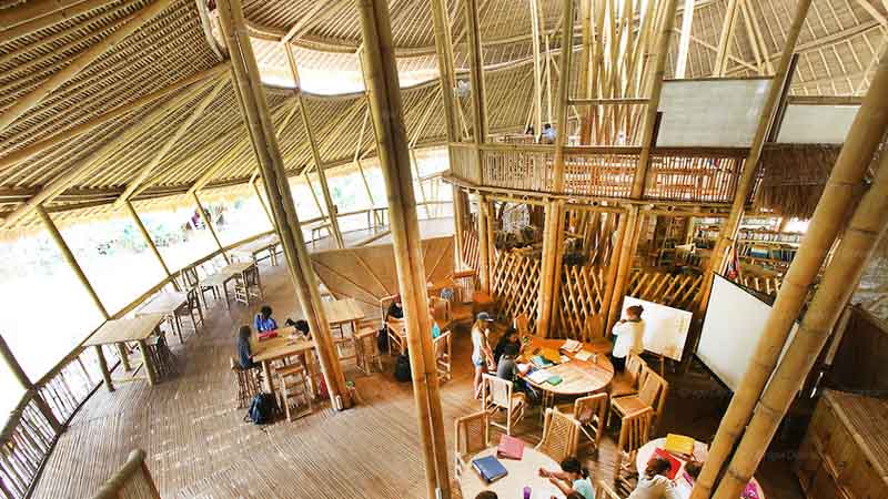 Voted as one of the greenest schools in the world. So this incredible space looks more like a resort than a school! While the sustainable bamboo campus includes classrooms, a gym, faculty housing, office, and cafes. And everything is powered by clean energy sources such as hydro-powered vortex generator and solar panels.