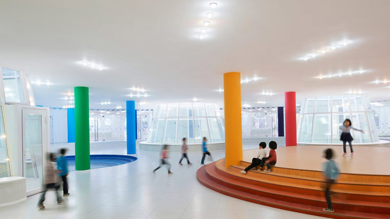 Not a single sharp corner exists in this school. So from the floor plan to the window sills, rounded edges make for a kid-friendly environment that is brought to life with 18 vivid colors. Hence the gradually transforming colors are used by the children to identify different areas in the structure so they don’t get lost.