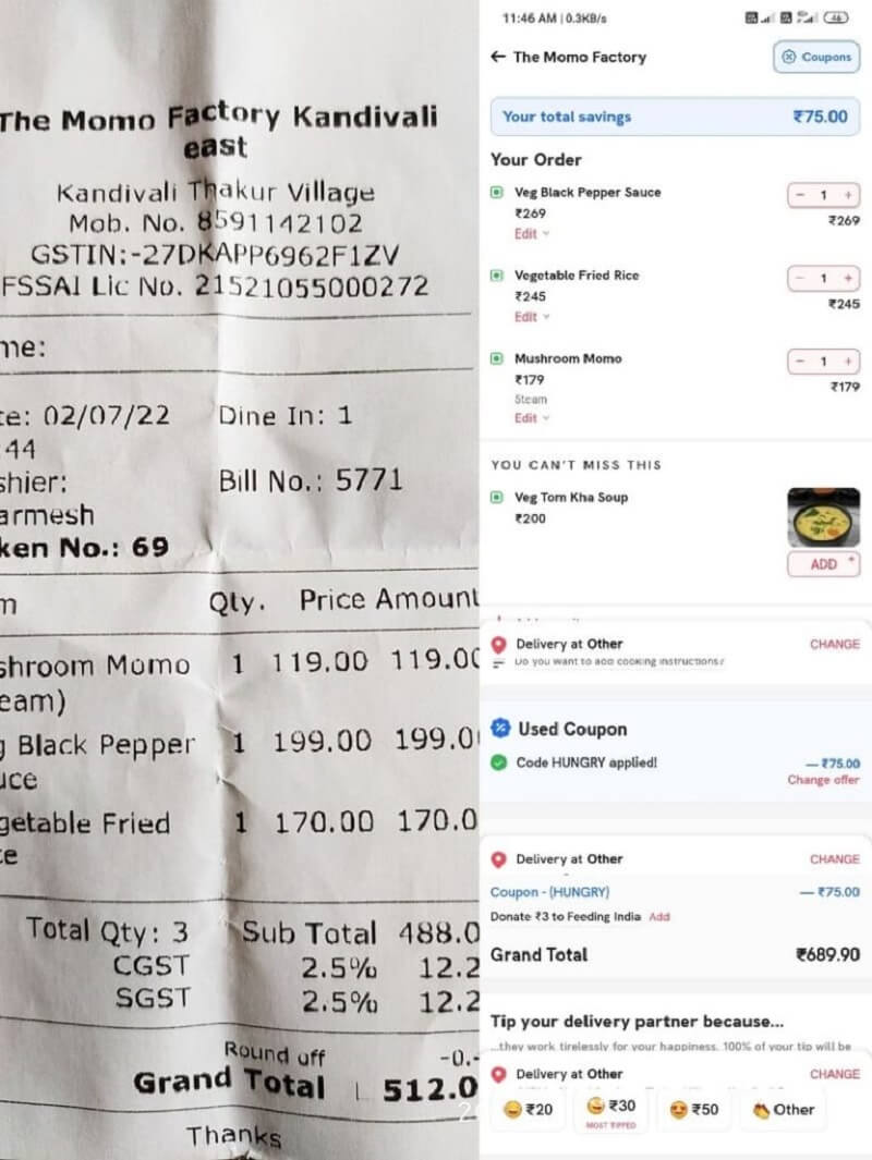 Kabra posted online that he had ordered mushroom momo, vegetable fried rice, and Veg Black Pepper Sauce. He placed the order from a restaurant on Zomato. The prices for the items were 175, 245, and 269 rupees, respectively. When he purchased the food at the outlet, the same products cost him INR 170, INR 199, and INR 119, respectively. Proof that #Zomato wants to profit more from each order than the restaurant! This was the title of Kabra’s post. Kabra remarked that the price of his offline order was Rs 512. While Zomato charged him INR 690 for the same stuff. The invoices had a discrepancy of INR 178.