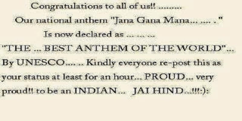 As an Indian, we are proud of our national anthem and it is, in fact, one of the most beautifully written and composed national anthem of the world but this is nothing then a well spread Rumour that UNESCO has declared it as the best national anthem. Thankfully it didn’t appear in our textbooks.