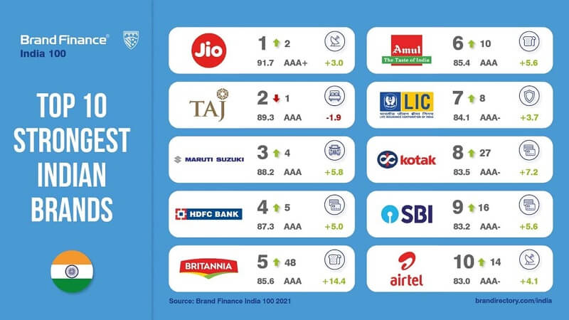 The report says that the sectors such as IT, healthcare, edutech, chemicals, utilities, construction, and banking have been efficient during this period. The list is based on a Brand Strength Index score. Jio is the strongest brand in India, with a Brand Strength Index score of 91.7 out of 100. Taj Group Of Hotels, Maruti Suzuki, HDFC Bank, and Britannia are other brands in the top 5 with a score of 89.3, 88.2, 87.3, and 85.6, respectively.