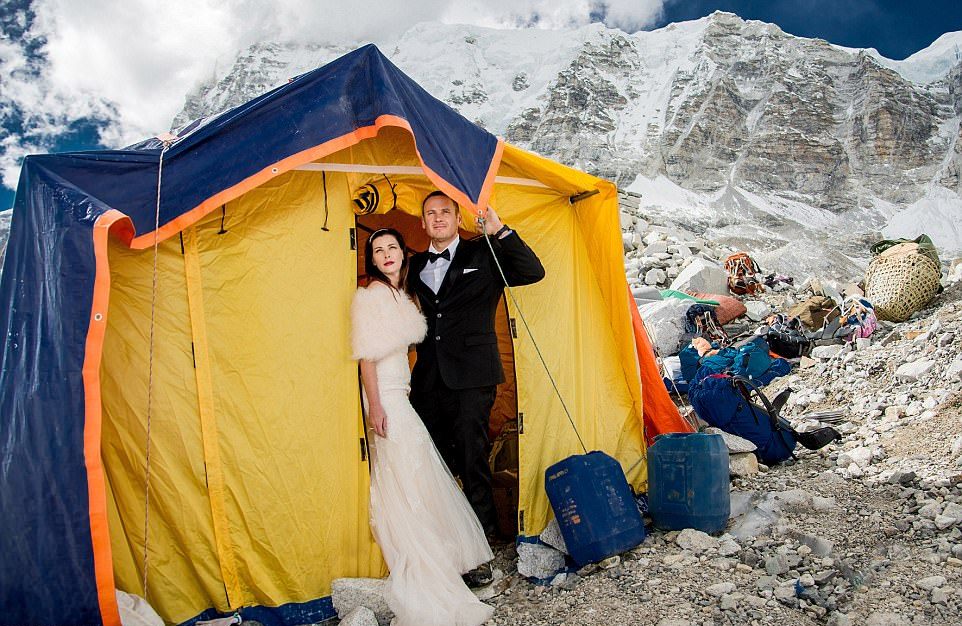 James Sissom, 35, and Ashley Schmieder, 32 spent three weeks trekking up to a Mount Everest base camp at 17,000 feet above sea level to get married. Surprisingly, they even took their wedding photographer, Churchill along with them.
