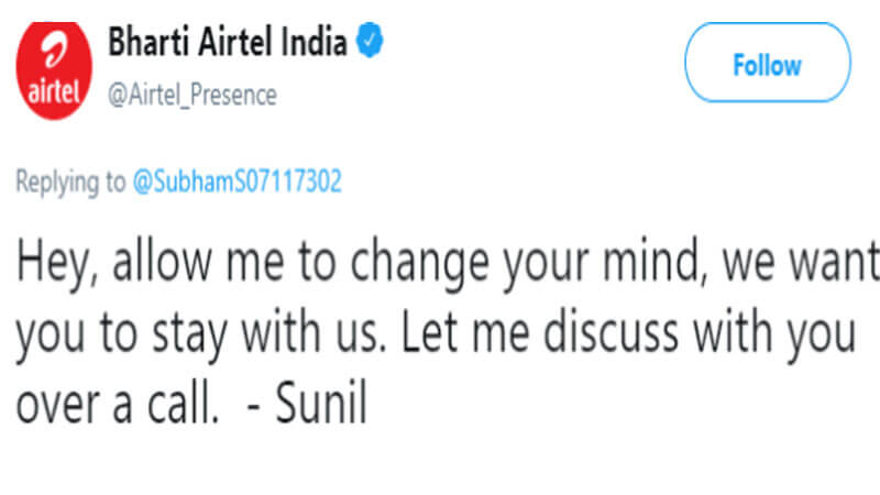 This conversation went viral on Twitter. Airtel even tried to pursue the customer on a call.