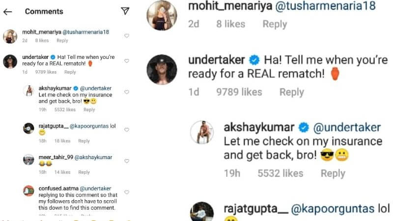 The post went viral, and many commented on the post. Even The Undertaker commented on the post and asked the actor when he is ready for the real rematch. Reacting to Akshay Kumar’s post, The Undertaker wrote: