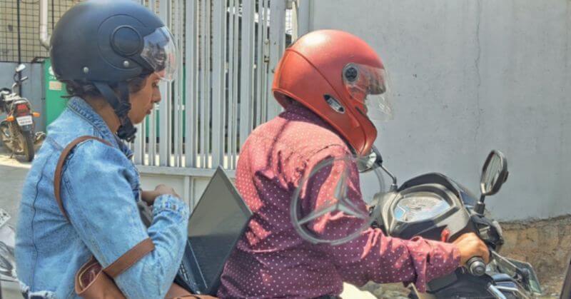 Bengaluru has considerable traffic congestion regularly due to its large concentration of technology businesses, educational institutions, and a growing population. As a result, traveling in the city may squander hours of valuable time, as this image of a lady working on her laptop while stopped in traffic demonstrates.