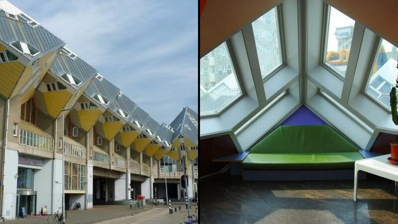 In order to encourage interaction between the public (the downstairs building) and the private (the upstairs cube), this cube house was built. Even though it functions as a pedestrian bridge, the cubes do have tenants.