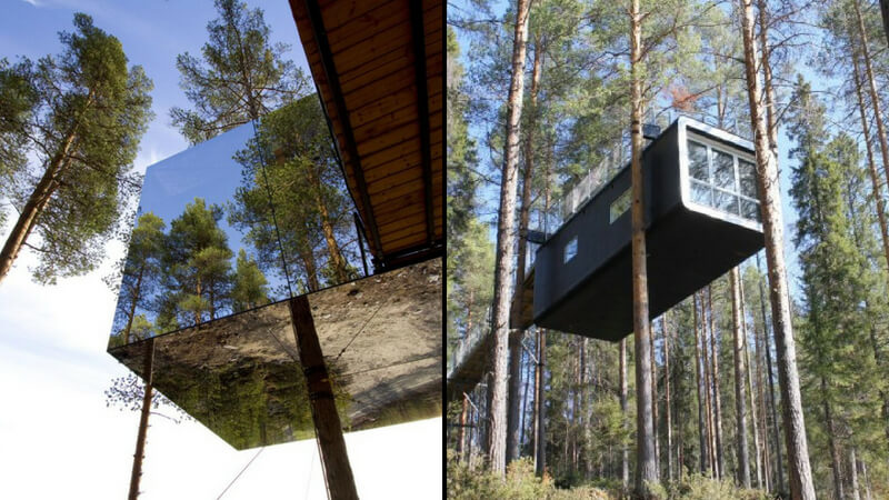 If you want to reach the entrance, you need to traverse a rope bridge connected to the next tree. Its a cube-shaped volume wrapped around the trunk of a tall tree. The hotel exterior is clad in mirrored glass that reflects the sky and the trees. The interior is made of plywood and offers 360 degrees of the landscape. It has a living area with a bedroom, a roof terrace, and a small bathroom.