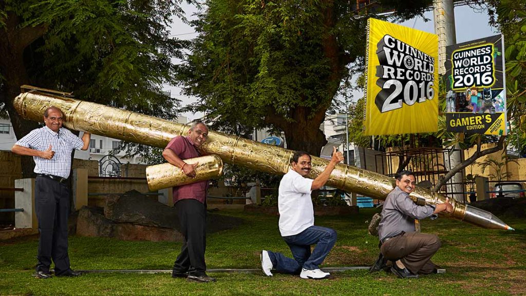 Acharya Makunuri Srinivasa, from Nizamabad, India who is 56 year old set the record of making the longest ballpoint pen measuring 5.5 m (18 ft 0.53 in) in length and weighing 37.23 kg.