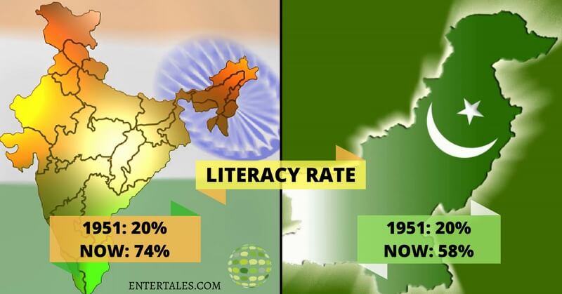 The literacy rate of India boosted from 20% in 1951 to 74% in 2015. However, the growth of the literacy rate of Pakistan is far below. Pakistan’s literacy rate is only 58%.