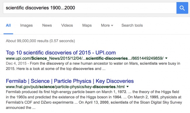 Many times, we urgently need to acquaint ourselves with events that occurred during a certain period of time. To do so, you can add a time frame to your search query with the help of three dots between the dates. For example, if we want to find out about scientific discoveries during the 20th century, we can write like above.