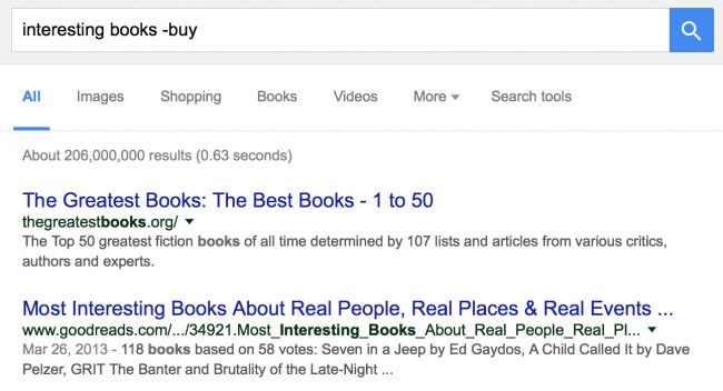 To totally remove unimportant search words from your query, simply type a minus symbol before each. For example, if you wish to find a site about some interesting books, but you aren’t looking to buy them, you can write like in above image.