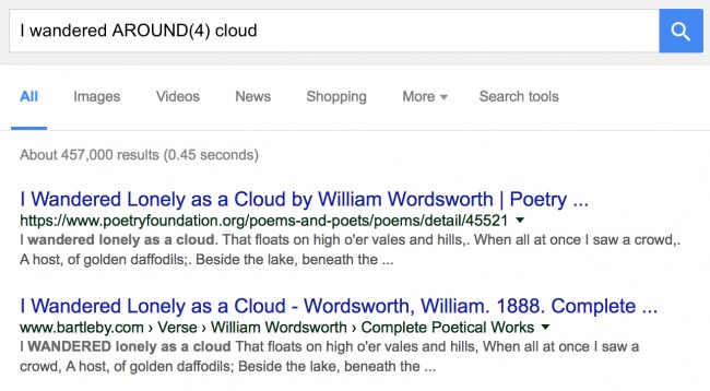 If it’s the lengthier half of the phrase you cannot remember rather than a single keyword, try writing out the first and last words and putting “AROUND + (the approximate number of missing words)“ between them. For example, ”I wandered AROUND(4) cloud.”