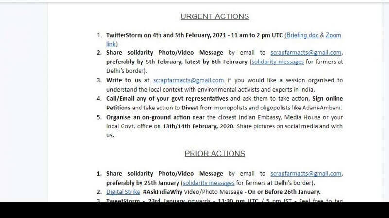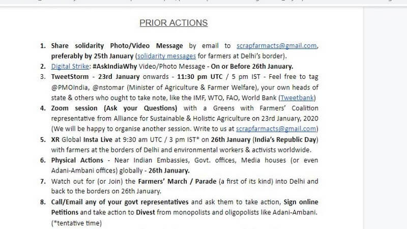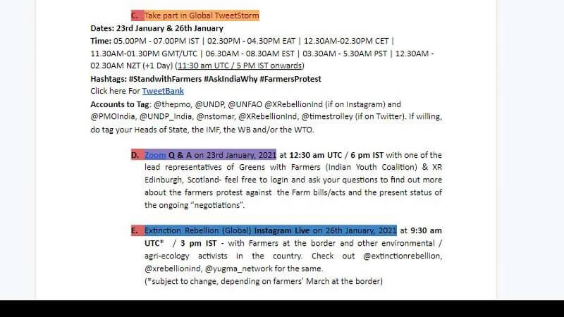 The farmer protest is no more a protest, it became an international agenda. Recently, International Pop Star Rihanna, social activist Greta Thunberg, former adult actress Mia Khalifa entered into the Farmers Protest. However, it is looking like a paid gimmick. Greta Thunberg exposed when she accidentally shared the document on details of the January 26 protests and upcoming online and street protests. Soon, the document was restricted and later she deleted the tweet. Check out her deleted tweet below.