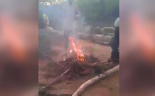 One of the pups is seen trying to wriggle out of the burning pile. The boy filming the video is heard egging his friends on.