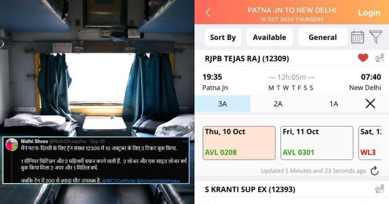 “I booked 3 tickets for Patna-Delhi on Train no. 12309 for October 10. 1 senior citizen and 2 women are traveling. 2 lower selected (sic) but got 2 upper and 1 middle berth. While there are more than 200 seats available in the train.”