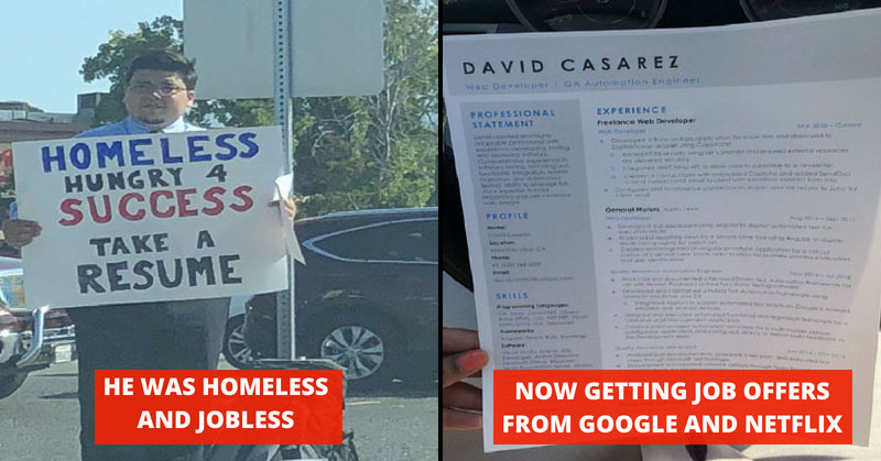 David worked with General Motors from 2014 to 2017 but he was fired from there. After that, he kept on offering his resume in the streets of Silicon Valley. After chronic failure, he refused to quit or go home. And, one a woman named Jasmine Scoffield saw him. It was quite weird to see a homeless man offering his resume instead of asking for money. She clicked his photo and shared it on twitter. She wrote, “Today I saw this young homeless man asking for people to take a resume rather than asking for money. If anyone in the Silicon Valley could help him out, that would be amazing. Please RT, so we can help David out!” After sometime #getdavidajob started trending on Twitter.