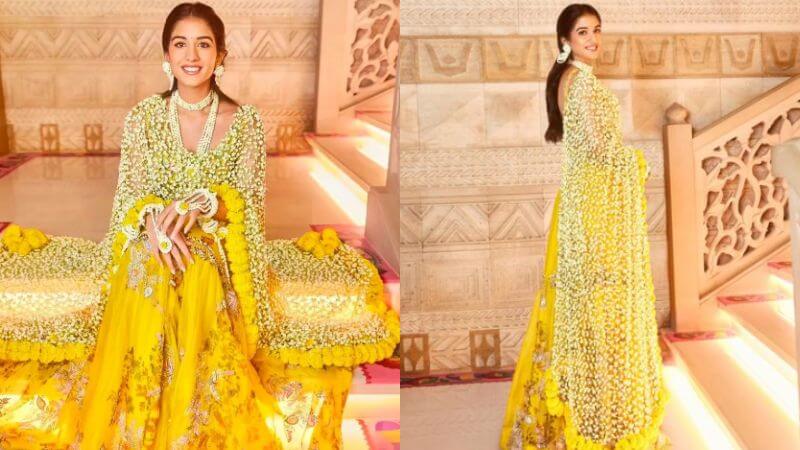 Mukesh Ambani and Nita Ambani hosted Anant Ambani and Radhika Merchant’s haldi ceremony on the night of July 8 at Antilia. Many Bollywood celebrities like Salman Khan, Sara Ali Khan, Janhvi Kapoor, and others grace the event. Radhika Merchant wears a yellow lehenga with real Mogra flowers dupatta.