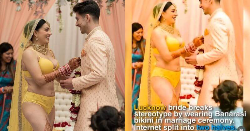 The text with the picture is “Lucknow bride breaks stereotype by wearing Banarasi bikini in the marriage ceremony. Internet split in two halves.”