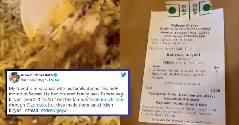 My friend is in Varanasi with his family during this holy month of Sawan. He had ordered family pack Paneer veg biryani (worth ₹ 1228) from the famous ‘@BehrouzBiryani‘ through @zomato, but they made them eat chicken biryani instead! @deepigoyal