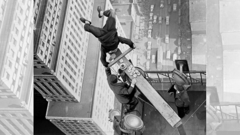 A very brave daredevil pulls of a headstand on a stick over a ledge for a magazine photoshoot. This was a very famous poster back then. Photography and stunts were a craze back then too!