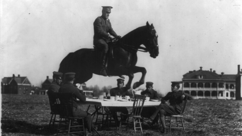 In this picture, a cool officer is jumping over the table with other officers seated around the table casually dining. Judging by their reaction, this seems to be a very usual and common stunt because they are so laid back and not flinching. Not even one bit! They are either too brave or very used to this stunt!