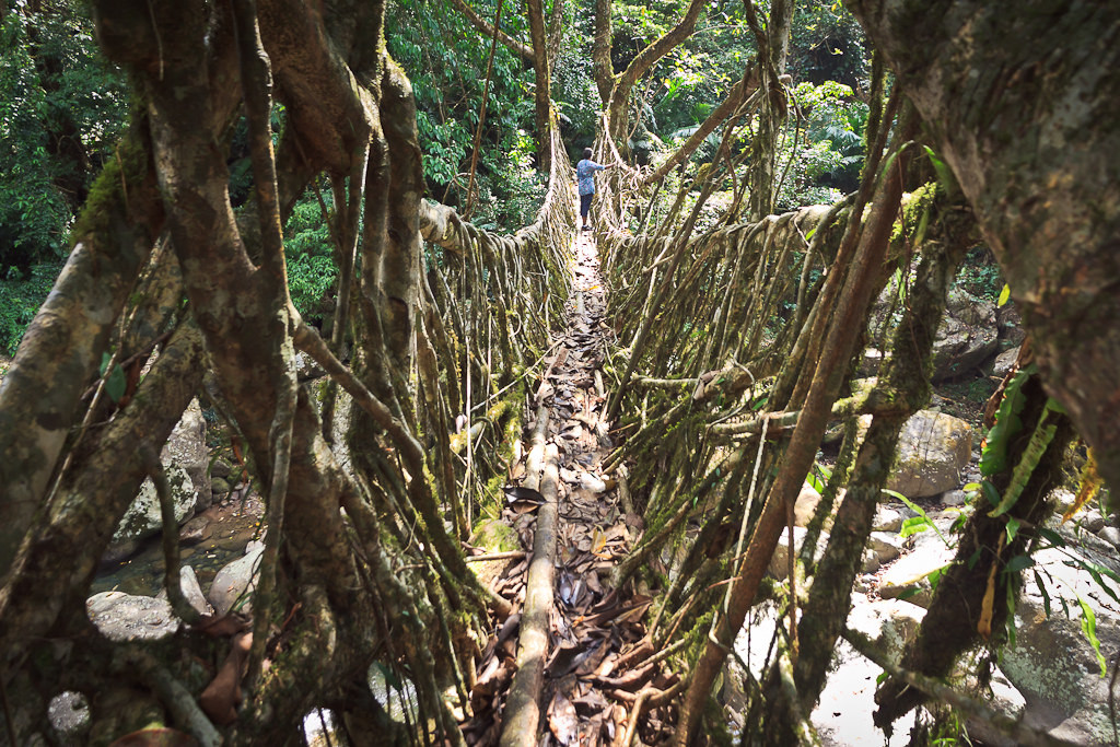 Deep in the dense tropical forest of Meghalaya, and shrouded in cloud and rain for much of the year, are some astonishing man-made natural wonders. Known as living root bridges, inventive members of the Khasi tribe have trained them to grow from the roots of ancient rubber trees, native to the northeast region. The root bridges provide a stable alternative to wooden bridges, which decay and get destroyed during the lengthy monsoon seasons.
