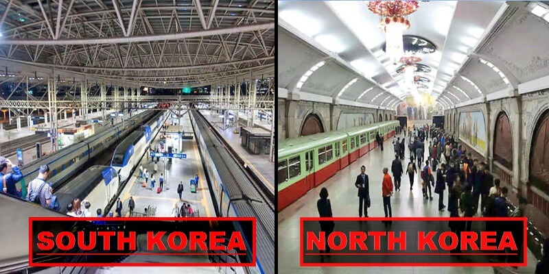 North Korean railway station looks underdeveloped and the trains look like they are historical. On the other hand the South Korean railway station is well equipped with modern technology.