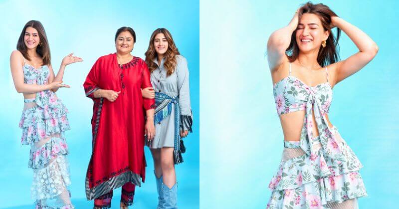 Like Kriti Sanon, her mother and sister also deserve full credit for their fashion statements. Her mother promoted ethnic suits in a crimson kurta and maintained their allure in the same Instagram image. But, she added a dash of contemporary elegance by choosing striped borders and an uneven hem. She accessorized her ensemble with a dupatta and straight leggings embellished with similar tassels.