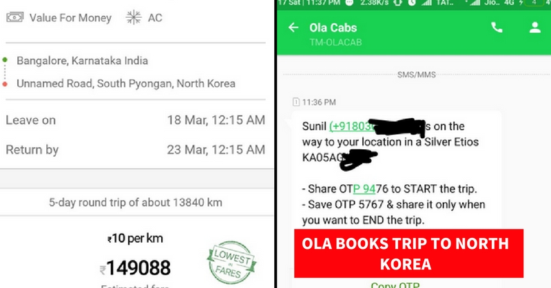 We all wish to take international trips and always look forward to chances through which we can go abroad. But, there are many challenges to the process of it. Thie first one is the commute. What if the local cab services like Ola and Uber could drive you all the way there. Yes, we know it’s not possible but it came true for Rohit Menda. Recently, he shared the screenshot of images on his Twitter account of his scheduled ride from Bangalore to North Korea booked through Ola! From Bengaluru to all the way to North Korea, yes.