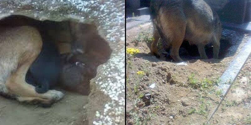The mother dog had delivered a litter of puppies and then had created a safe den for them over the grave of her owner.