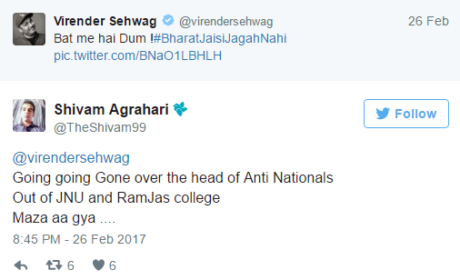 Tweeples thanked Virender Sehwag for his stand against anti nationals and JNU brigade.