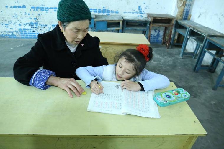The loving granny helps her in school even in the classroom and supports her in doing her homework and also attends class together.