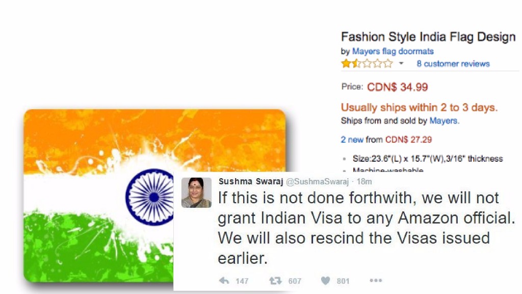 External Affair Minister, Sushma Swaraj have been in recent trends for her dutiful responses to people’s queries. Again, the minister has fulfilled a bigger duty by maintaining the decorum of Indian flag. On Wednesday, it was brought to the notice of external affair minister that doormats with Indian flags are being sold on Amazon Canada website. Post this, the minister took an immediate notice and tweeted, “Indian High Commission in Canada: This is unacceptable. Please take this up with Amazon at the highest level”.