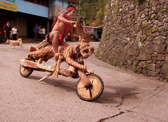 Ifugao (Philippine for “people of the hill) in Banaue has long preferred the wooden scooter as a means of transportation and still using even today as a cheaper alternative to gas-powered motorcycles and scooters. The men-folk had to walk up the surrounding hills almost every day to gather firewood and tend to their rice crops, and carrying the load back down was an exhausting task that took them hours to complete. People started making light scooters almost entirely out of wood, and pushed them uphill whenever they had something to transport back to their village.
