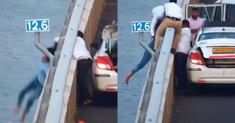A cab driver is seen catching a woman while she tries to jump off the bridge. Later traffic police came to rescue as they pulled the woman to safety. However, the reason behind the woman’s suicide attempt is still unknown.