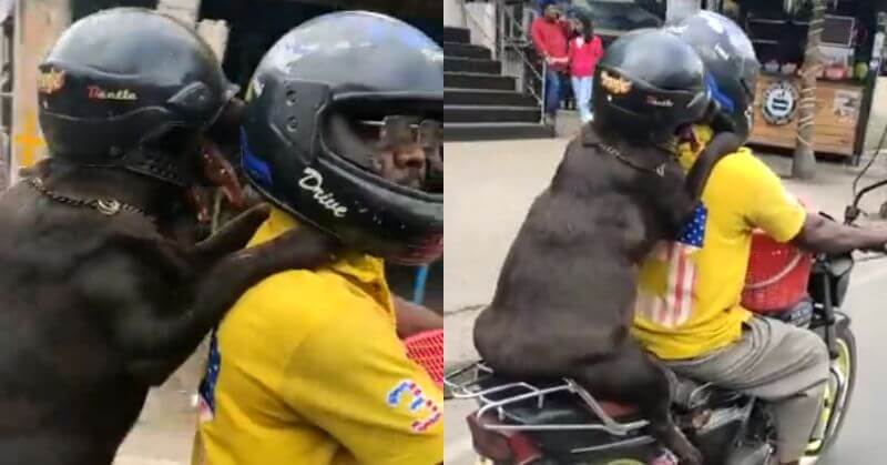 Recently, a person can be seen riding a bike while wearing a helmet. A black Labrador sat behind the rider, with its front paws resting on the rider’s shoulders. However, what draws everyone’s attention is that the furry friend is also wearing a ‘helmet.’