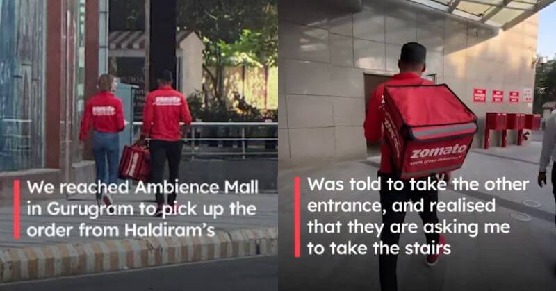 “We reached Ambience Mall in Gurugram to pick up the order from Haldiram’s. I was told to take the other entrance, and realized they were asking me to take the stairs. Went in again on the main entrance to make sure there aren’t any elevators for delivery partners.”