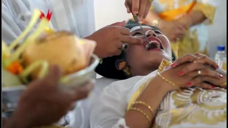 In an ancient Asian tradition, teenage girls are dressed up in beautiful garments and they lay on a table. The village people would cut off the tip of her tongue this is done to ensure a happy marriage one day.